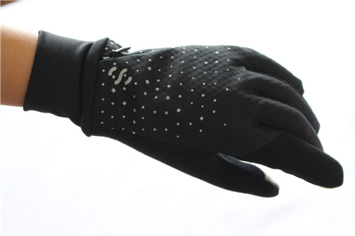 特点: 柔软、舒适、透气 有触屏功效 手背特别以满天星设计具有反光起到反光防护的作用 左手手背拉链设计可放置钥匙等小物件